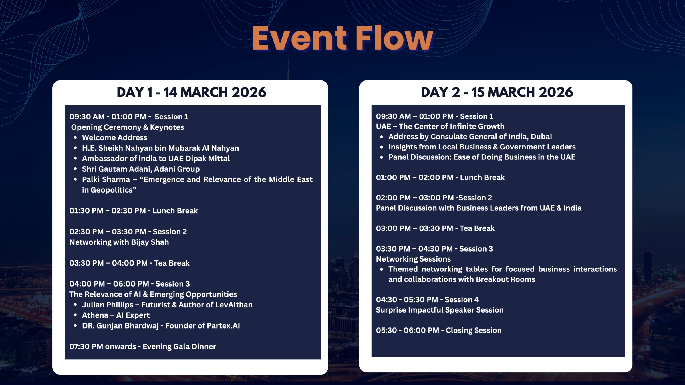 The agenda features keynote addresses, high-impact panel discussions, and focused networking sessions covering topics such as AI and emerging technologies, wealth preservation, ease of doing business in the UAE, and the Middle East’s evolving geopolitical and economic role.
