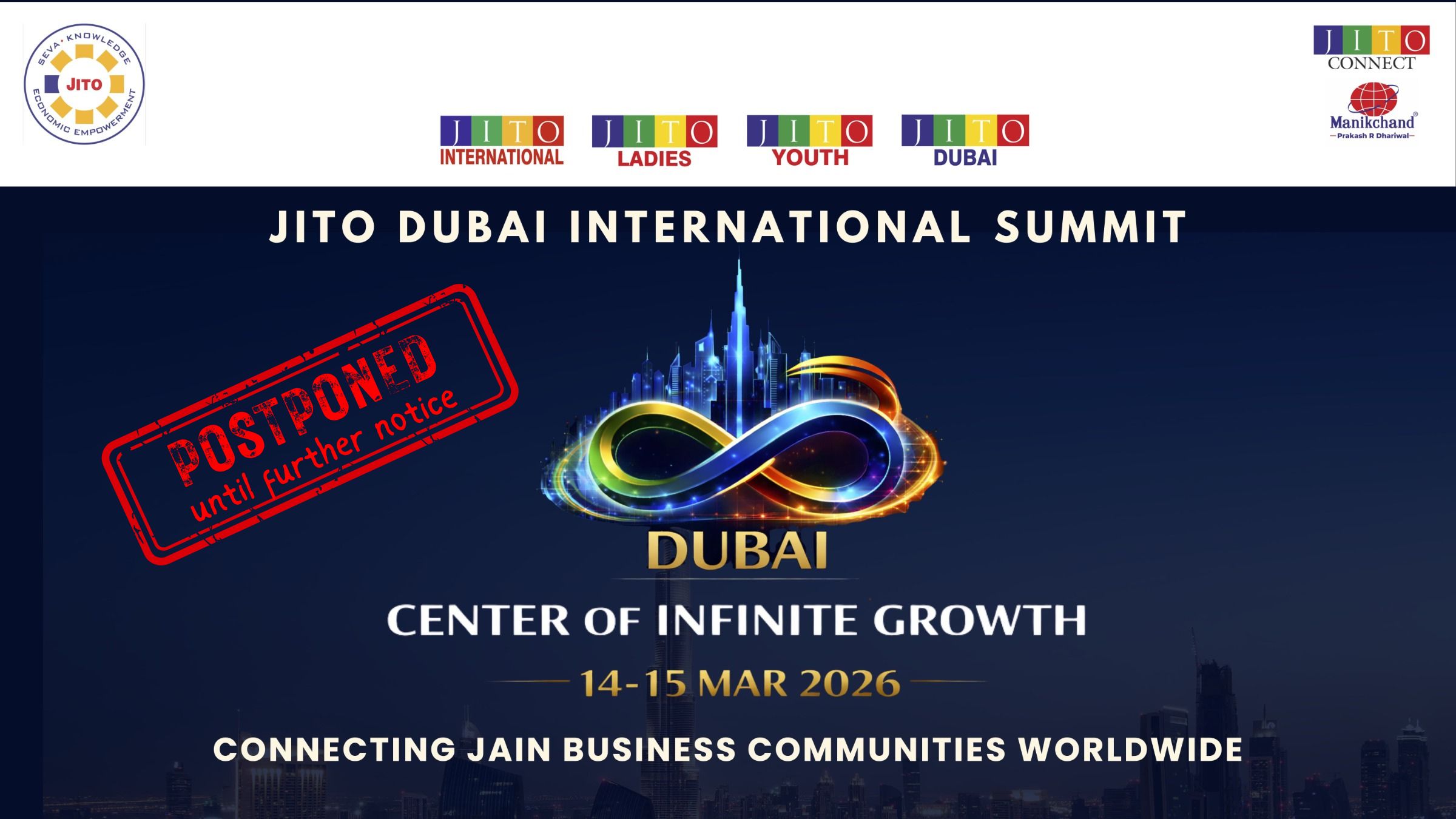 The JITO International Summit Dubai 2026 will take place on 14–15 March 2026 at the InterContinental, Festival City, Dubai. Bringing together 600+ delegates from over 22 countries and 65+ chapters, the summit is set to be one of the most influential global gatherings of Jain entrepreneurs, industrialists, policymakers, and business leaders.